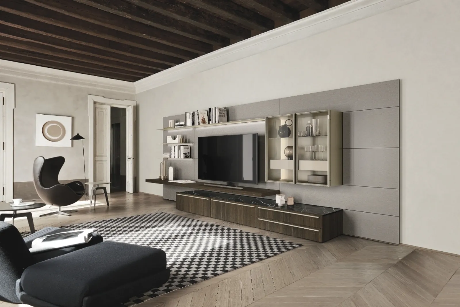 Attraverso un gioco dinamico di accostamenti fra componenti a giorno o vani chiusi, le Pareti Attrezzate moderne arredano il soggiorno ottimizzando ogni spazio. Questa parete attrezzata è una delle soluzioni della firma e ti permetterà di allestire il living secondo le più particolari problematiche abitative. Per informazioni e preventivi sulla Parete Attrezzata Lampo 198 di Sangiacomo nella fotografia contattaci! Il modello proposto è realizzato in legno, ma grazie ad un'ampia gamma di texture, tonalità e forme, potrà adattarsi a stili di ogni genere.