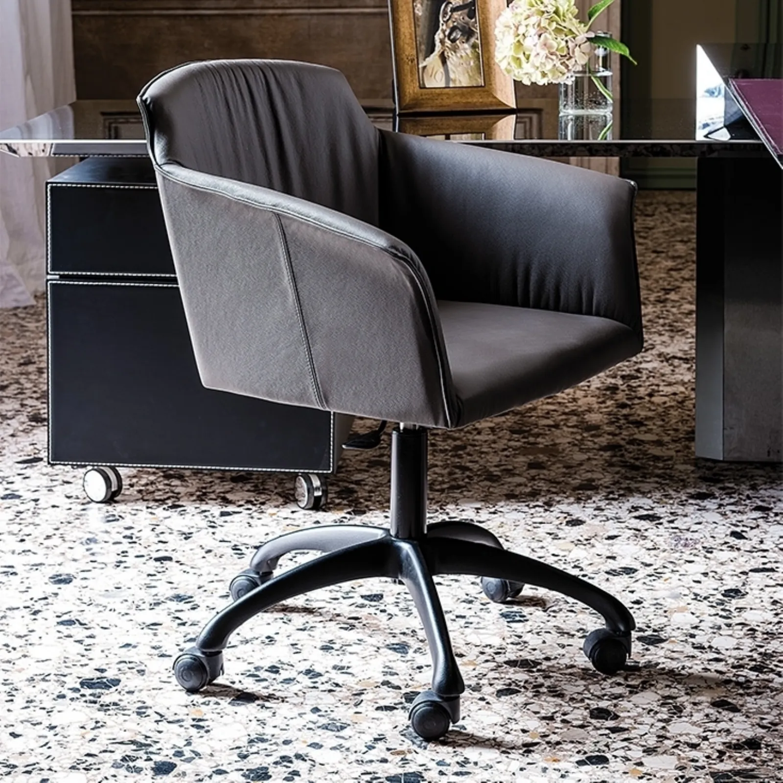 Allestire attentamente l'ambiente lavorativo è molto importante per offrire il comfort per i lavoratori e l’accoglienza per i clienti: il nostro showroom ti aspetta. In showroom puoi visionare in prima persona le più esclusive soluzioni arredative di Arredo Ufficio in pelle, sempre di ottima qualità e ideali per locali di ogni genere. Per il tuo Arredo Ufficio assumono un ruolo di centrale importanza le composizioni con sedie operative in pelle, studiate per attrezzare lo spazio. Sedia operativa girevole Tyler Wheels di Cattelan Italia: è uno dei migliori esempi di arredi per gliambienti lavorativi funzionali e belli da vedere del rinomato brand.